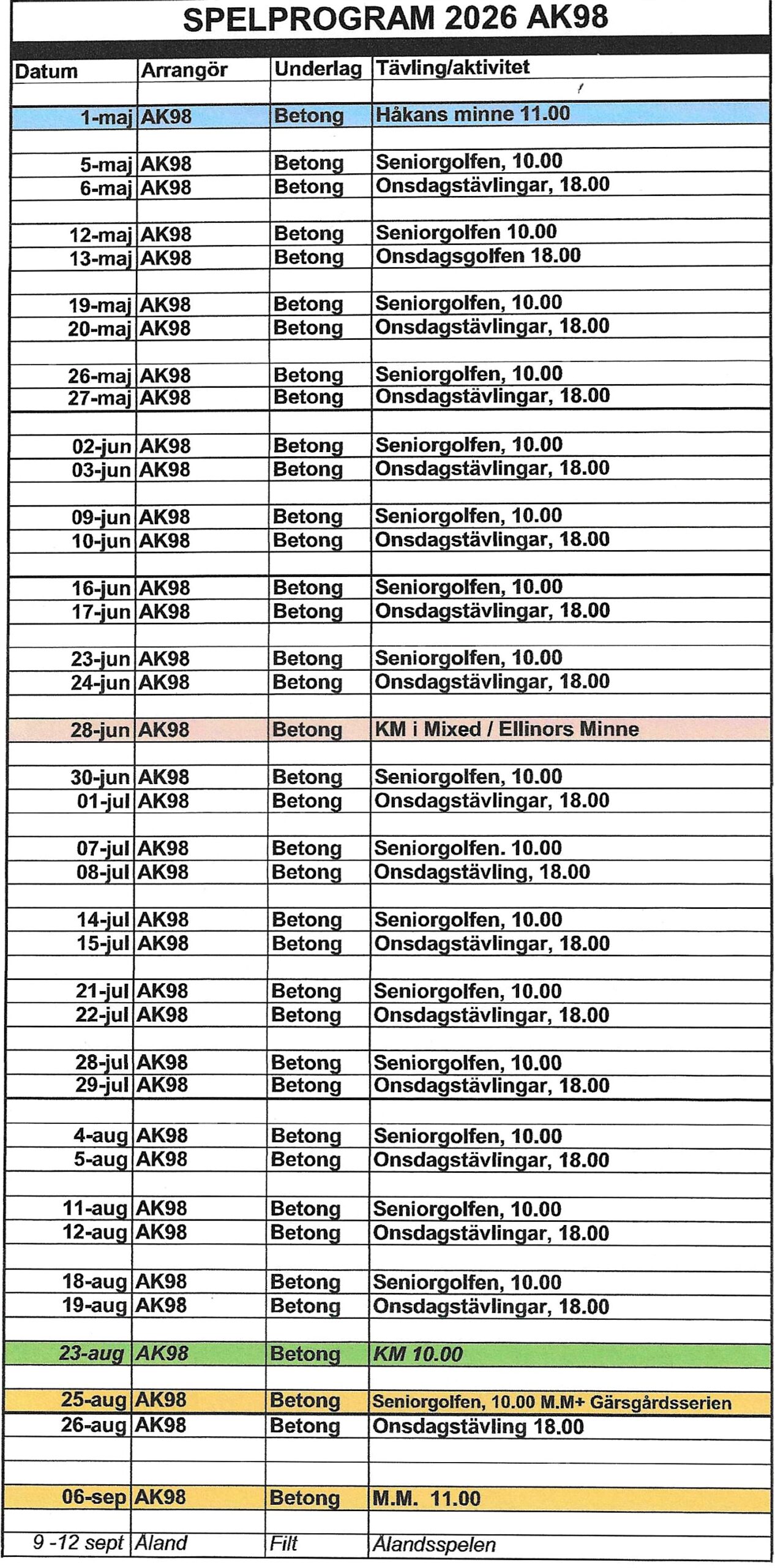 AK 98 är en aktiv förening med nästan 100 medlemmar – en av Sveriges största bangolfklubbar. Bangolfparken är en av de vackraste anläggningarna i vårt avlånga land med banor som ligger i en park med prunkande växtlighet.